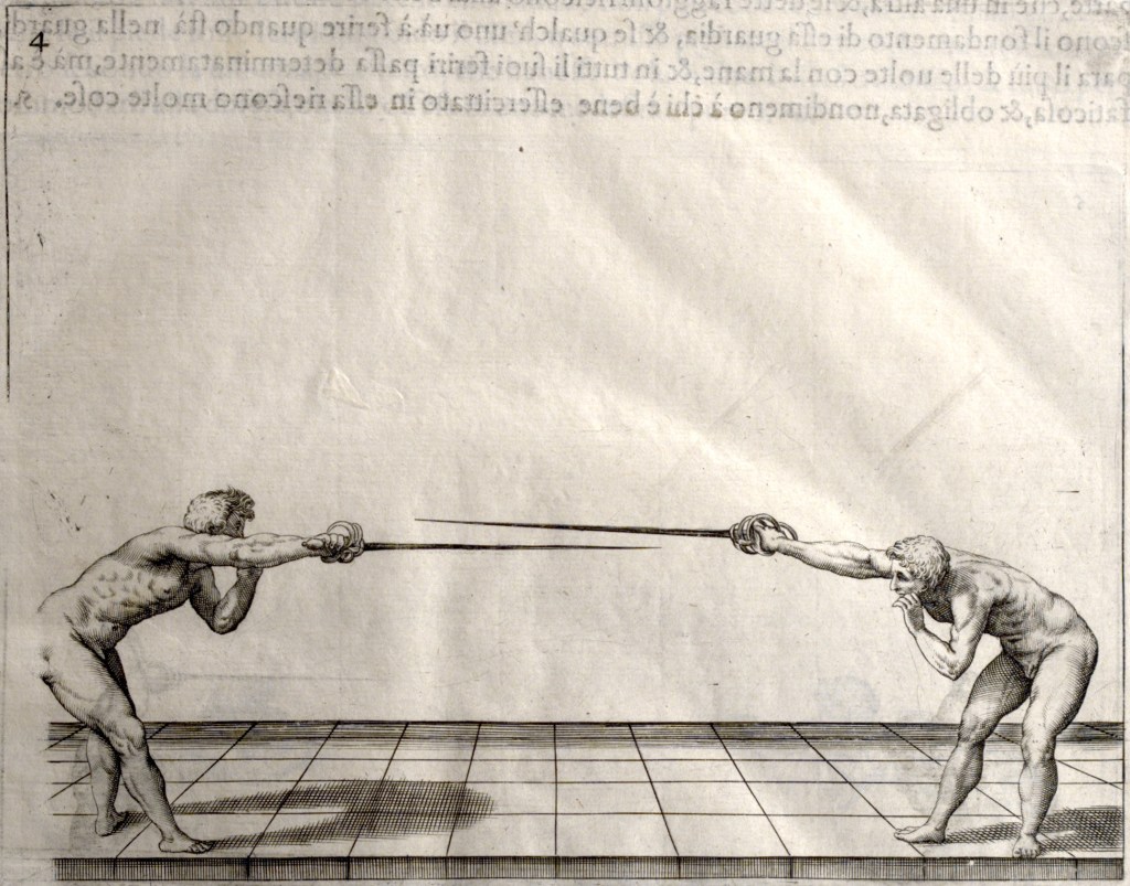 - “Della seconda guardia ben accomodata … Questo e il sito, col quale si dée formare la seconda guardia per sicurezza maggiore… perché il braccio e alquanto più basso, e perché la parte di fuori e la più debile, perciò si ha da tenere la punta tanto diritta, che ‘l nimico non posta venire in quella parte.” — wie man die Seconda zu mehreren Sicherheit formieren soll … weil aber der auswendige Theil am schwächsten / muß man deswegen die Spitze um so viel desto gerader führen / daß der Feind daselbst nicht ankommen könne. (Hynitzsch, 1677; 67/68).